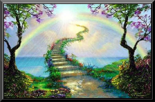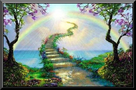 dann betritt es diese in allen Farben leuchtende Regenbogen-Brücke - und findet im Jenseits sein Paradies: